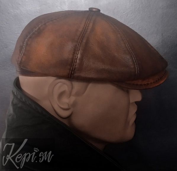 Модель 100-999. Кепка кожаная восьмиклинка Камбэк бро. Натуральная оригинальная кожа с винтажным эффектом потертостей, подкладка головного убора из вискозы. Цвет коричнево рыжий. Сейчас можно купить эту качественную шапку по цене со скидкой.